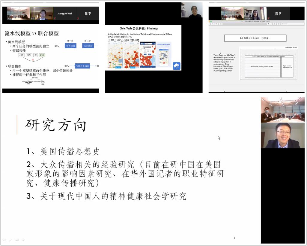 本次论坛采用视频方式进行交流,4名青年学者分别结合自己的研究方向,介绍各自科研成果,并分享了海内外学习工作经历。学术报告内容涉及自然语言处理、大众传播、新媒体传播和政治传播等内容,评审专家结合学科前沿及学术热点,针对青年学者的研究成果及未来规划进行了深入的交流与研讨。